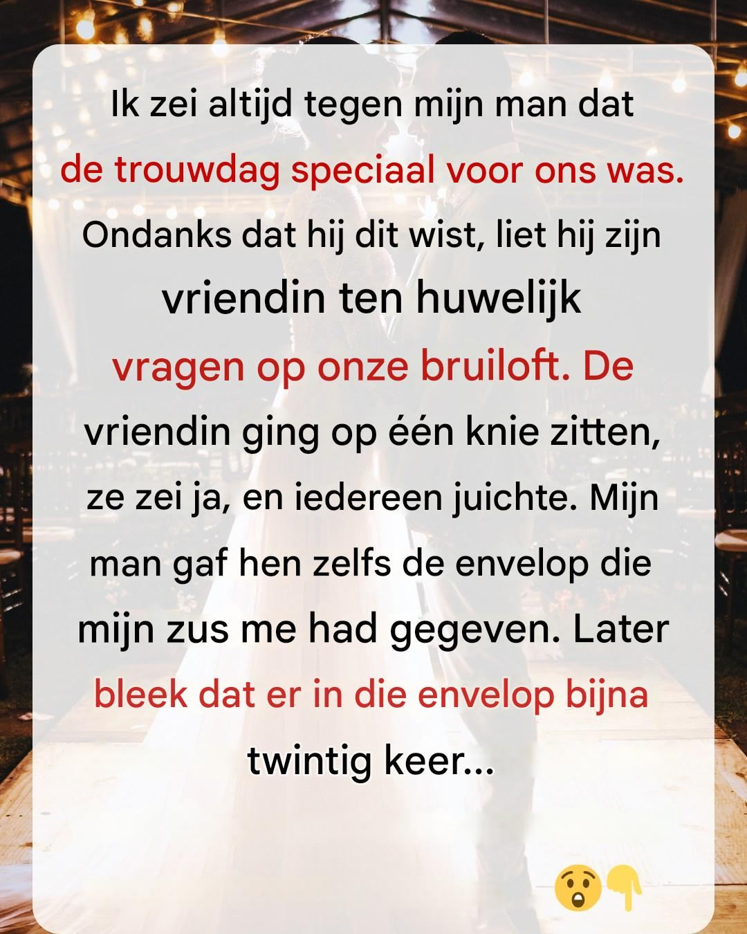 Ik zei altijd tegen mijn man dat de trouwdag speciaal voor ons was. Toch, ondanks dat hij dit wist, liet hij zijn vriendin ten huwelijk vragen op onze bruiloft. De vriendin ging op één knie zitten, ze zei ja, en iedereen juichte. Mijn man gaf hen zelfs de envelop met het geld dat mijn zus me had gegeven.
