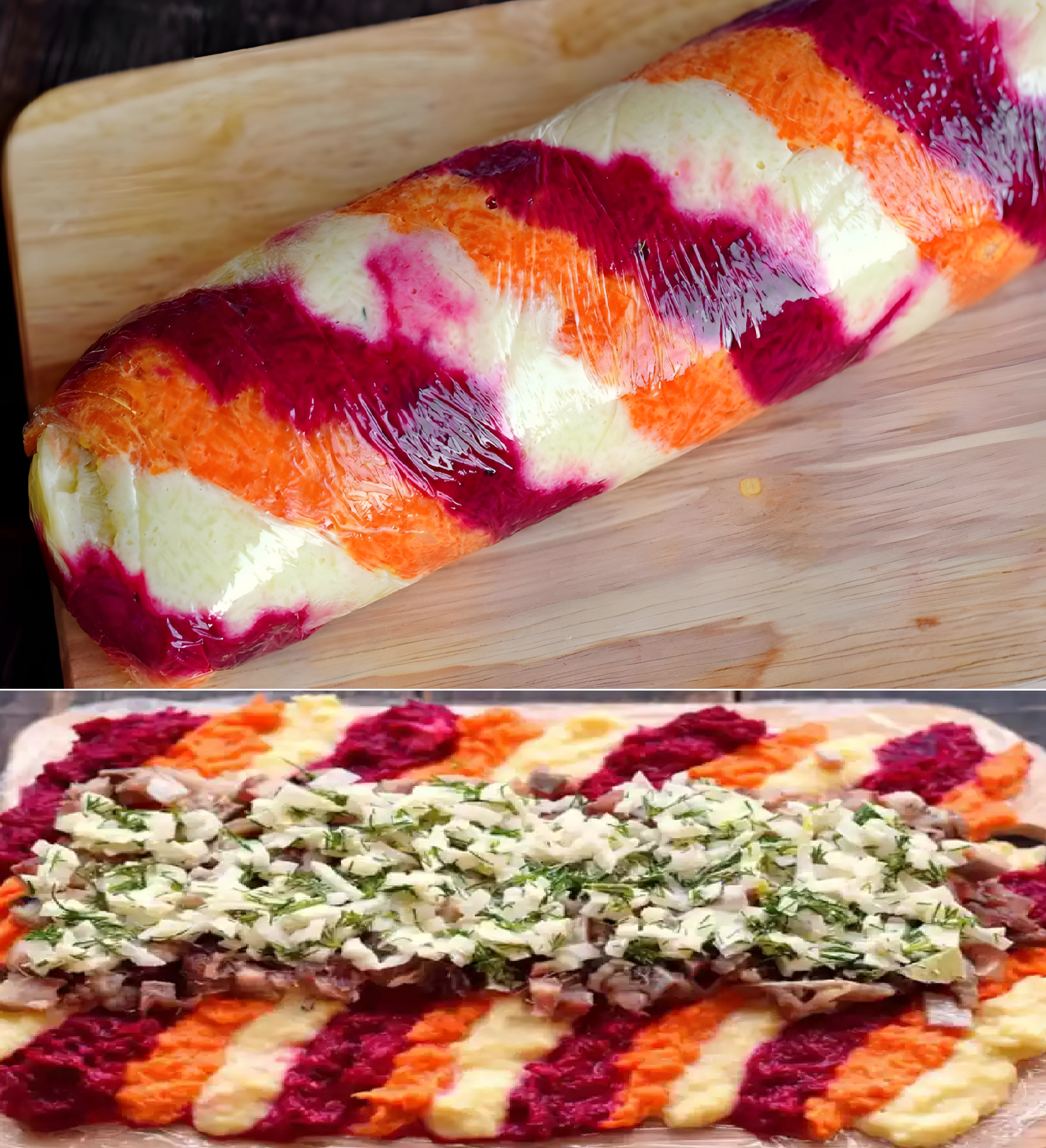 We bieden een ongewone portie van de beroemde « Shuba »-salade aan. De salade bestaat uit een drielaagse rol van groenten met een vulling van haring en uien. Om ervoor te zorgen dat de rol zijn vorm goed behoudt en niet uit elkaar valt, voegen we een beetje gelatine toe aan de groenten, waardoor de rol volledig geleivrij wordt. Deze rol is perfect voor speciale gelegenheden en ziet er prachtig en origineel uit op tafel.