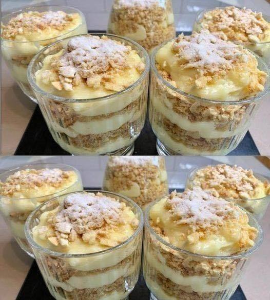 Doe 2 eetlepels zandkruimels in glazen of kopjes.