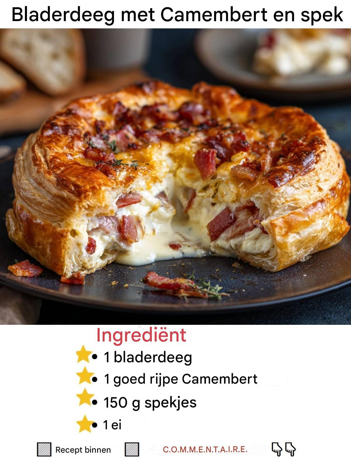 Bladerdeeg met camembert en spek is een eenvoudig maar spectaculair recept, perfect voor liefhebbers van gesmolten kaas en comfort food. Onder een goudbruin, knapperig bladerdeeg ligt een smeltende kern van camembert, versterkt door de rokerige smaak van spek. Dit royale en gezellige gerecht is in een paar minuten klaar en kan als voorgerecht of als hoofdgerecht met een groene salade worden genoten.