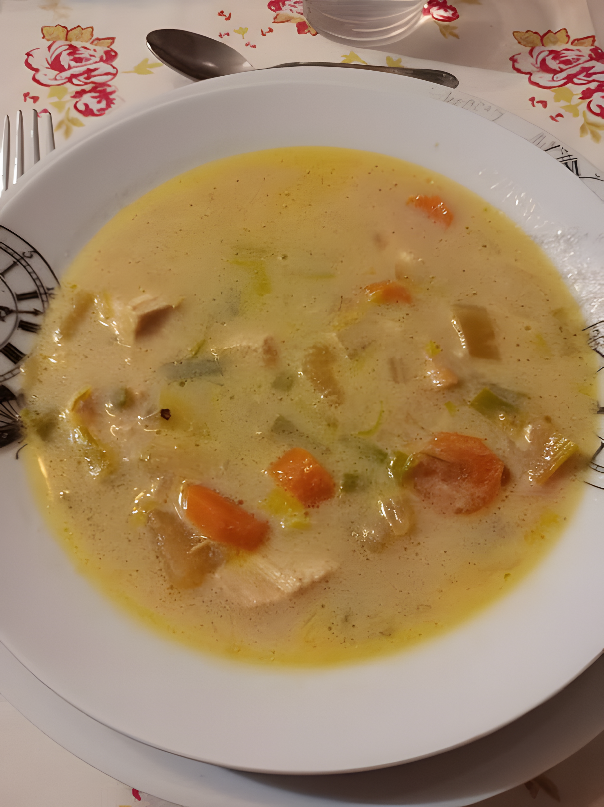 Ingrediënten (voor 4-6 personen): 2 kipfilets (of 300 g gekookte kip, in stukjes gesneden) 1 prei (in ringen gesneden) 2 wortelen (in plakjes gesneden) 1 stengel bleekselderij (fijngehakt) 1 ui (fijngehakt) 2 teentjes knoflook (fijngehakt) 1 liter kippenbouillon 200 ml kookroom 2 eetlepels boter 2 eetlepels bloem 1 laurierblad 1 theelepel tijm Zout en peper … Lire plus
