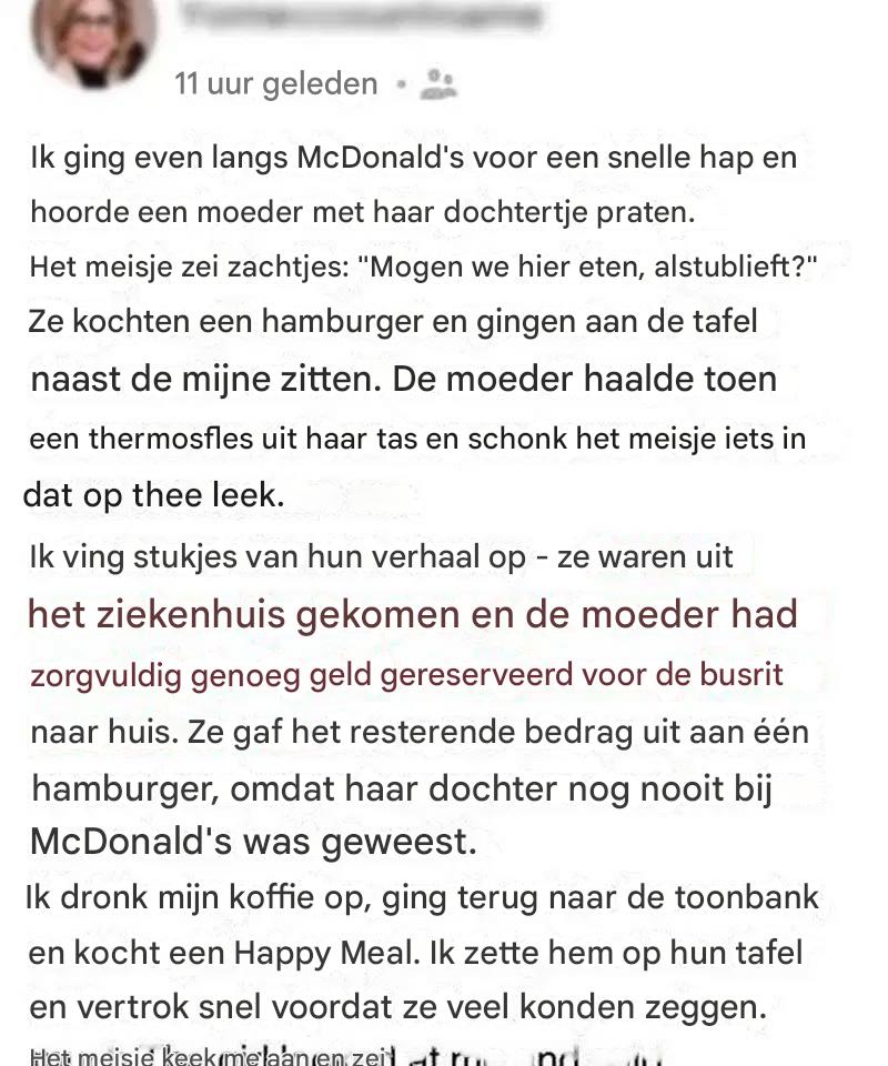 Het was maar een gewone middag toen ik bij een McDonald’s stopte voor een snelle maaltijd. Ik verwachtte niets gedenkwaardigs – alleen een korte pauze op een drukke dag. Maar soms heeft het leven een manier om de eenvoudigste momenten te gebruiken om ons eraan te herinneren wat er echt toe doet.