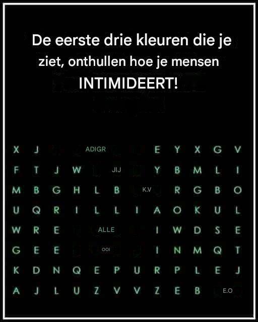 Kijk goed naar de afbeelding hieronder. De eerste drie kleuren die je ziet, zouden laten zien hoe je anderen van nature intimideert – of dat nu door zelfvertrouwen, intelligentie, creativiteit of pure aanwezigheid is.