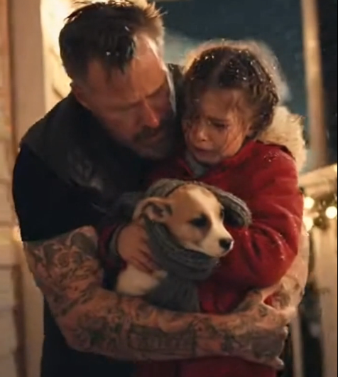 Het tafereel was bijna surrealistisch: een klein meisje, niet ouder dan acht, lag opgerold op de bevroren houten trappen voor een huis waarvan de ramen nog warm gloeiden van de kerstsfeer. Een dik pak sneeuw bedekte het gazon, waardoor elke ademhaling een bleke, spookachtige gloed werd. Naast haar, hevig rillend, lag een kleine bastaardhond met verwarde vacht en een gerafeld rood lintje om zijn nek. Iemand had hem daar achtergelaten – een paar ogenblikken geleden – als een pakket dat teruggestuurd was naar de afzender.