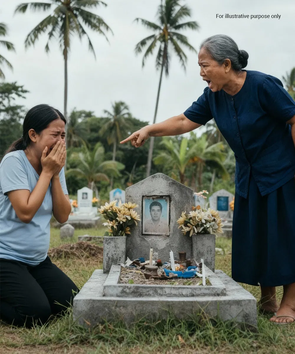 « Een vrouw als jij verdient het niet om in dit huis te wonen! Je bent een wh:o:re, je man is net d:i:ed en je hebt al een a:f:fair! Zoiets walgelijks is er niet in mijn huis. Ga weg!