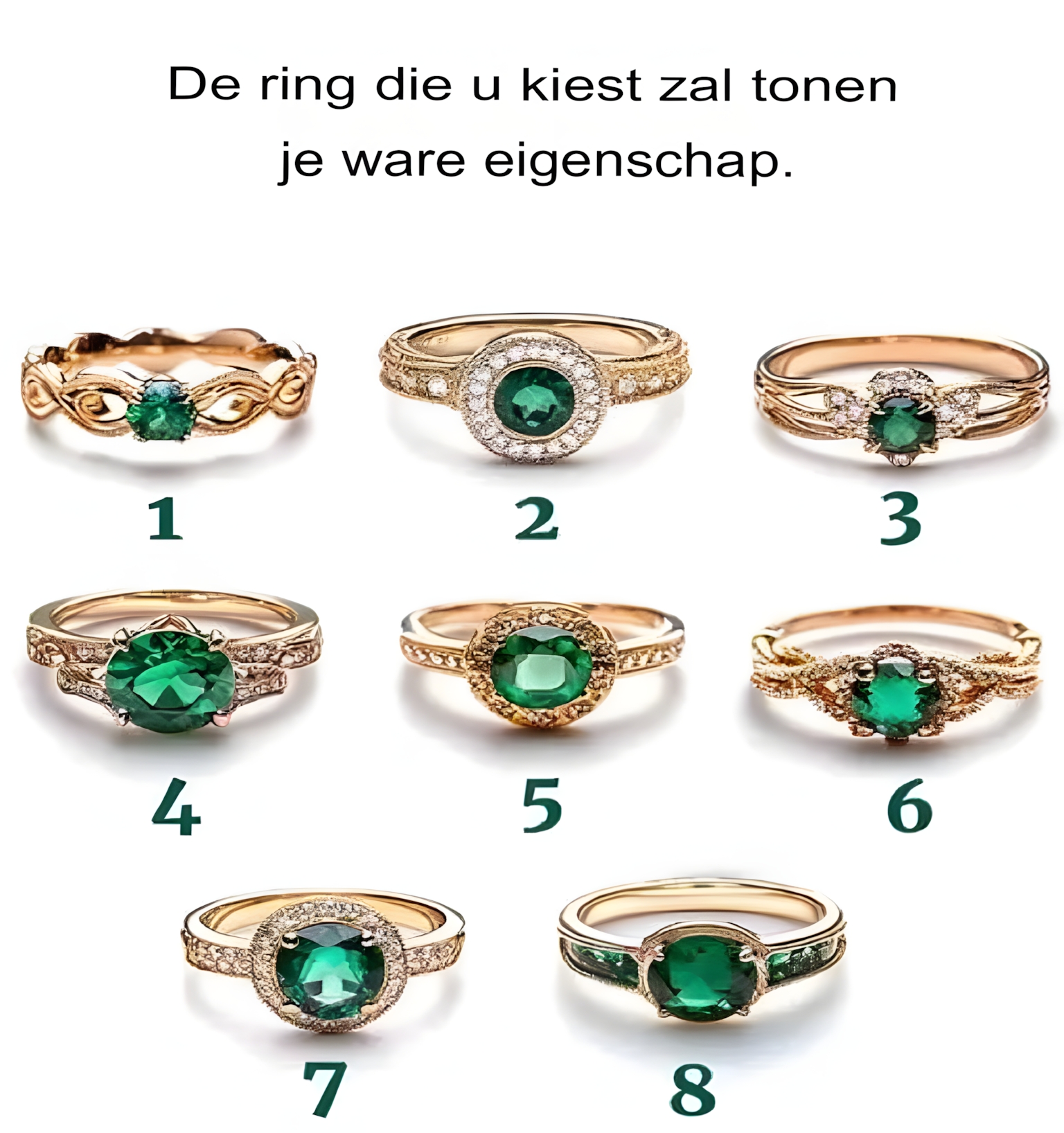 Als u kiest voor ring nr. 2, laat u zien dat u houdt van tijdloze schoonheid en verfijning. U bent evenwichtig en elegant en u straalt zelfvertrouwen uit. Jouw onberispelijke smaak reikt verder dan mode en beïnvloedt elk aspect van je leven. Mensen bewonderen uw wijsheid en uw vermogen om weloverwogen beslissingen te nemen.