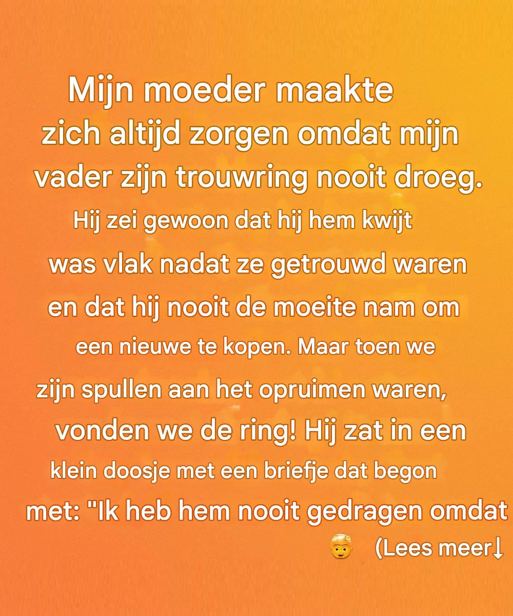 In het begin vroeg ze zachtjes, half plagend, half nieuwsgierig. « Waarom draag je het niet? » zou ze zeggen, terwijl haar ogen naar zijn hand dwaalden. Hij glimlachte met die vertrouwde, geruststellende glimlach en antwoordde elke keer met dezelfde woorden: