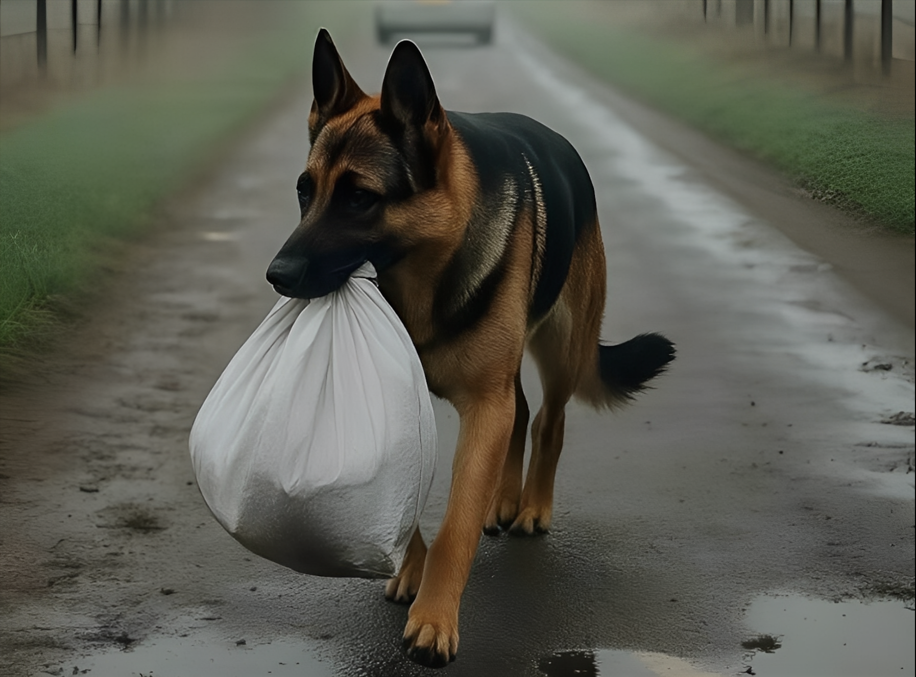 De vrouw bleef staan, drukte zich tegen de berm en probeerde het dier niet te hinderen. Met dus gekeken hoe de herder de hoek van de straat naderde. Daar remde plots een auto naast de hond af. De bestuurder zette de motor niet eens uit: hij sloeg gewoon de deur open, greep handig de zak uit de bek van de hond – en reed onmiddellijk weg, achter de bocht uit het zicht.