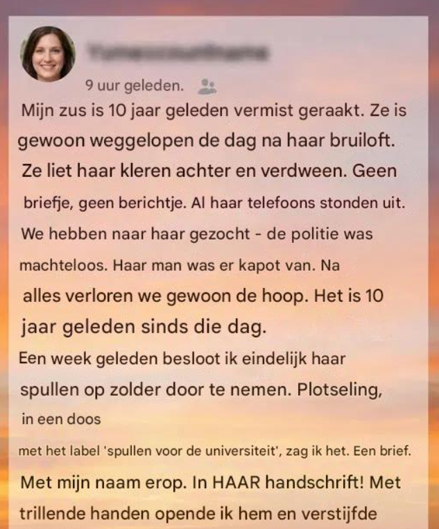 Mijn zus verdween tien jaar geleden. De ochtend na haar bruiloft was ze spoorloos. Haar kleren waren achtergebleven. Geen bericht, geen uitleg. Al haar telefoons stonden uit. We hebben overal gezocht, maar de politie vond niets. Haar man was er kapot van. Naarmate de tijd verstreek, vervaagde de hoop langzaam. Tien jaar gingen voorbij in stilte.