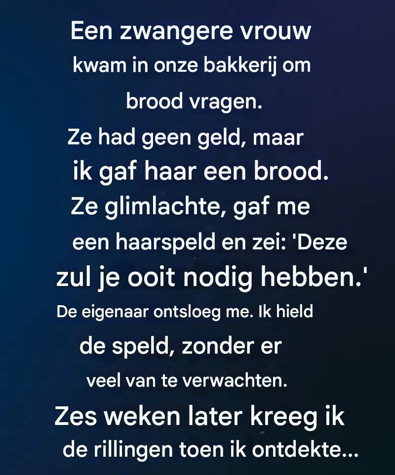 Ze glimlachte, gaf me een haarspeld en zei: « Dit heb je op een dag nodig. »