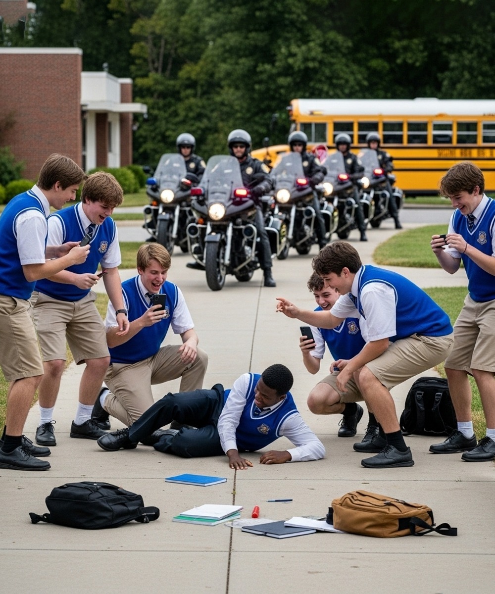 « Binnen, » zei de ruiter met de zilveren baard zachtjes. « We zorgen ervoor dat jullie aankomen waar jullie heen moeten. » Een pad opende zich in de menigte. Gefluister in de gang werd stil. In het kantoor van de directeur sprak de hoofdrijder – Cole Matthews – met de kalme precisie van iemand die in moeilijkere ruimtes moeilijke waarheden had verteld. « We waren getuige van een gericht incident bij jullie poort, » zei hij. « Deze leerling werd tegen de grond geduwd. Er werden boeken geschopt. Verschillende omstanders. Geen volwassene aanwezig. » De beveiliging maakte beelden. Feiten maakten plaats voor geposeer. Tegen de tijd dat de lunchpauze aanbrak, waren er telefoontjes gepleegd, ouders op de hoogte gebracht en waren de consequenties begonnen: schorsingen, counseling, schriftelijke excuses. Het verhaal bereikte elke uithoek van de campus vóór de bel ging.