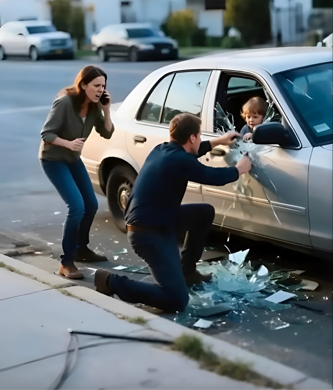 Binnenin zat een baby — niet ouder dan één jaar — vastgespt in een autostoeltje, zwetend, met een rood gezicht door de hitte, en geen volwassene in zicht. Hij huilde en hapte naar adem.