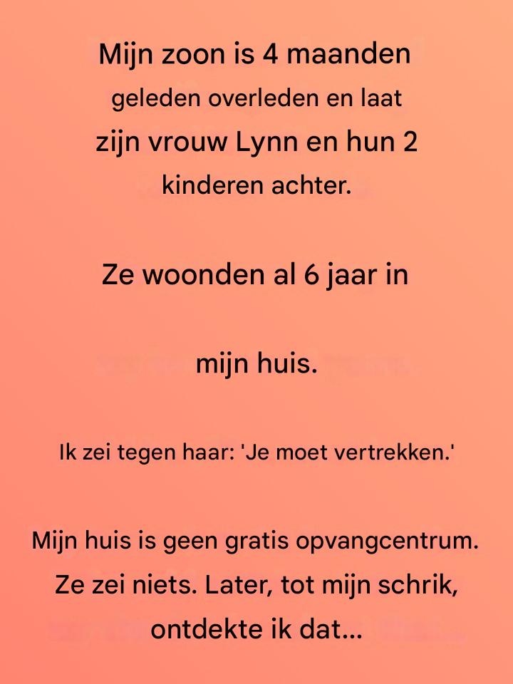 Toen mijn zoon vier maanden geleden overleed, stortte mijn wereld in op manieren die ik nooit had kunnen voorbereiden. Hij liet zijn vrouw, Lynn, en hun twee kleintjes achter – die allemaal de afgelopen zes jaar onder mijn dak hadden gewoond. Het huis dat ooit overstroomde van gelach, kleine voetstapjes en de dagelijkse chaos van het gezin, voelde plotseling ondraaglijk stil. Elke kamer droeg een herinnering met zich mee. Elke hoek herinnerde me aan wat ik had verloren.