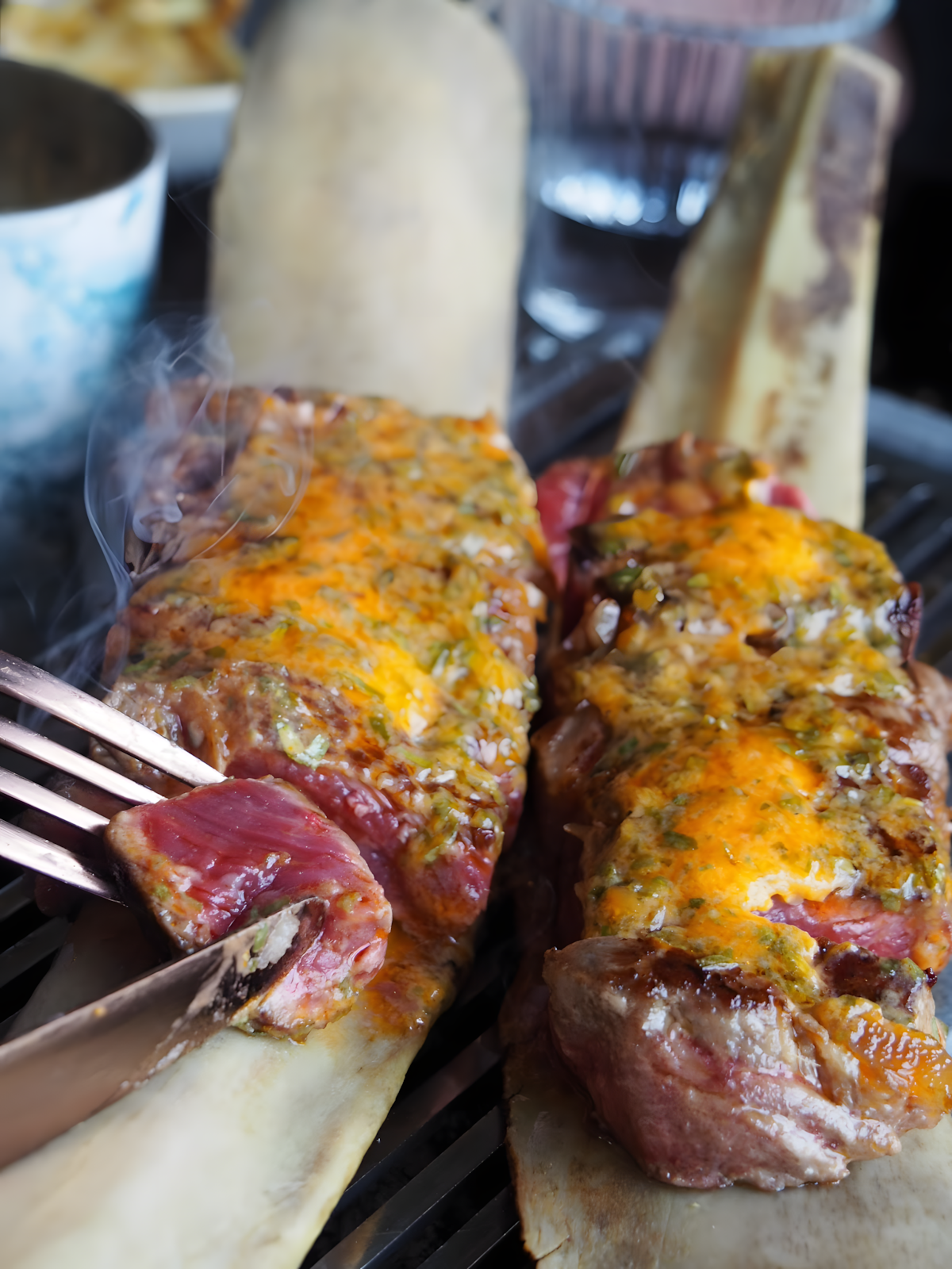 Het tweede gerecht, een salade van spinazie, verraste me ook; een ongelooflijk malse en zachte Nobashi-garnaal werd gemengd met kleine stukjes foie gras en gerookte paling in een zoute saladedressing. Het derde gerecht dat volgde, was een perfect romige aardappelpuree met een langzaam gegaard ei, Iberische ham en natuurlijk truffel. Een mix van romig, een beetje knapperig, umami en zout maakte dit een heel bijzonder – en vullend – gerecht. Ik vond het geweldig hoe alles perfect samenkwam en hoe de texturen verschillend waren en zo goed bij elkaar pasten. Tot slot een medium-rare stukje Amerikaans prime beef, geserveerd met dunne aardappelfrietjes, een mosterdschuimsaus en een gegrilde sjalot. Ik vond deze erg lekker, het vlees was perfect gegaard, geglazuurd met een pittige saus, maar miste een beetje smaak, dus misschien had een gelukkige koe uit Frankrijk of Spanje het net zo goed of zelfs beter gedaan. Een dessert is niet inbegrepen in het menu, maar we bestelden een koffie en kregen er verse (ze waren nog warm) in de oven gebakken Canelés Bordelaises bij; die kleine Franse gebakjes die knapperig vanbuiten zijn, zacht en smeuïg vanbinnen en zeer verslavend.