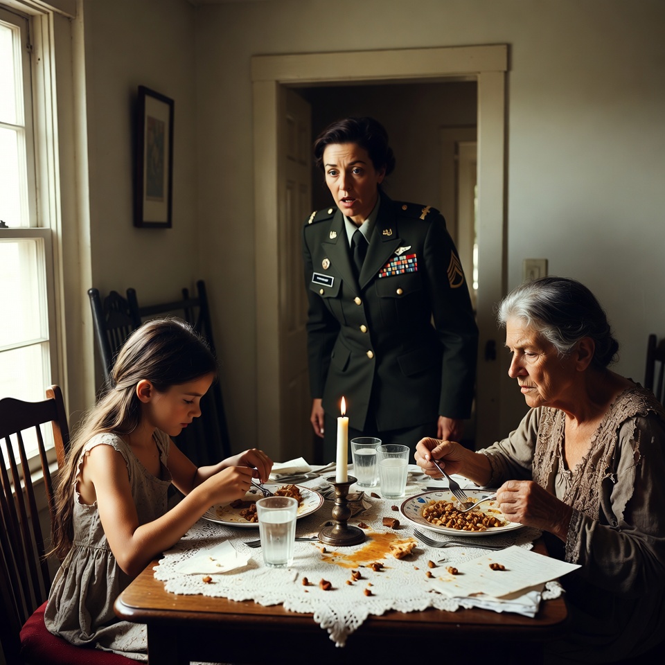 De vrouw droeg een jas die eruitzag alsof hij door motten was aangevreten. Haar grijze haar was verward en stak onder een dunne, gescheurde sjaal uit. Naast haar zat een klein meisje in een trui die drie maten te groot was, met gerafelde, zwarte manchetten. Ze rilde hevig.
