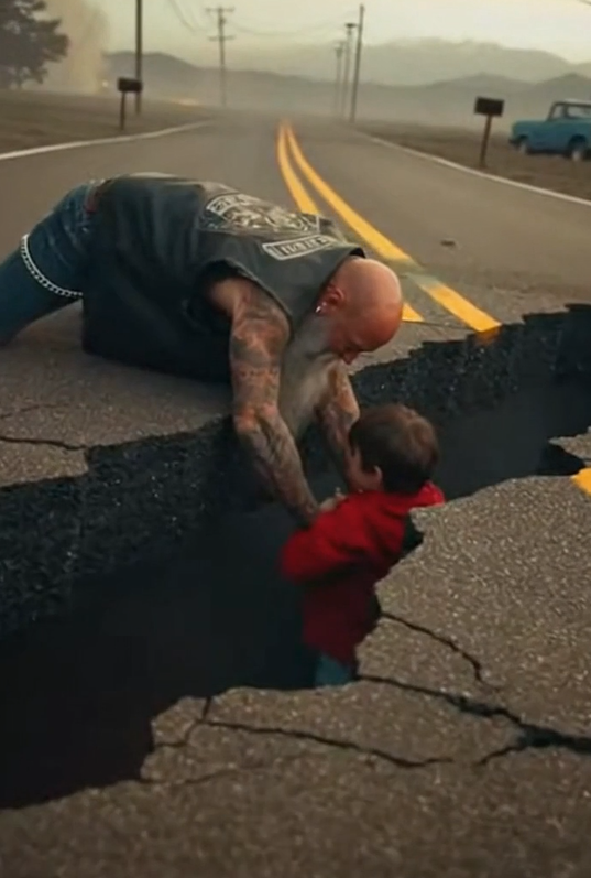 Door de trillende straten en het neervallende stof sneed een brul door de chaos heen – het diepe, constante gezoem van een motorfiets. Een motorrijder remde abrupt af aan de rand van de steeds breder wordende scheur, zijn leer kraakte bij elke beweging, zijn helm onder zijn arm geklemd. Zonder een moment te aarzelen boog hij zich voorover, zijn sterke armen naar beneden reikend.