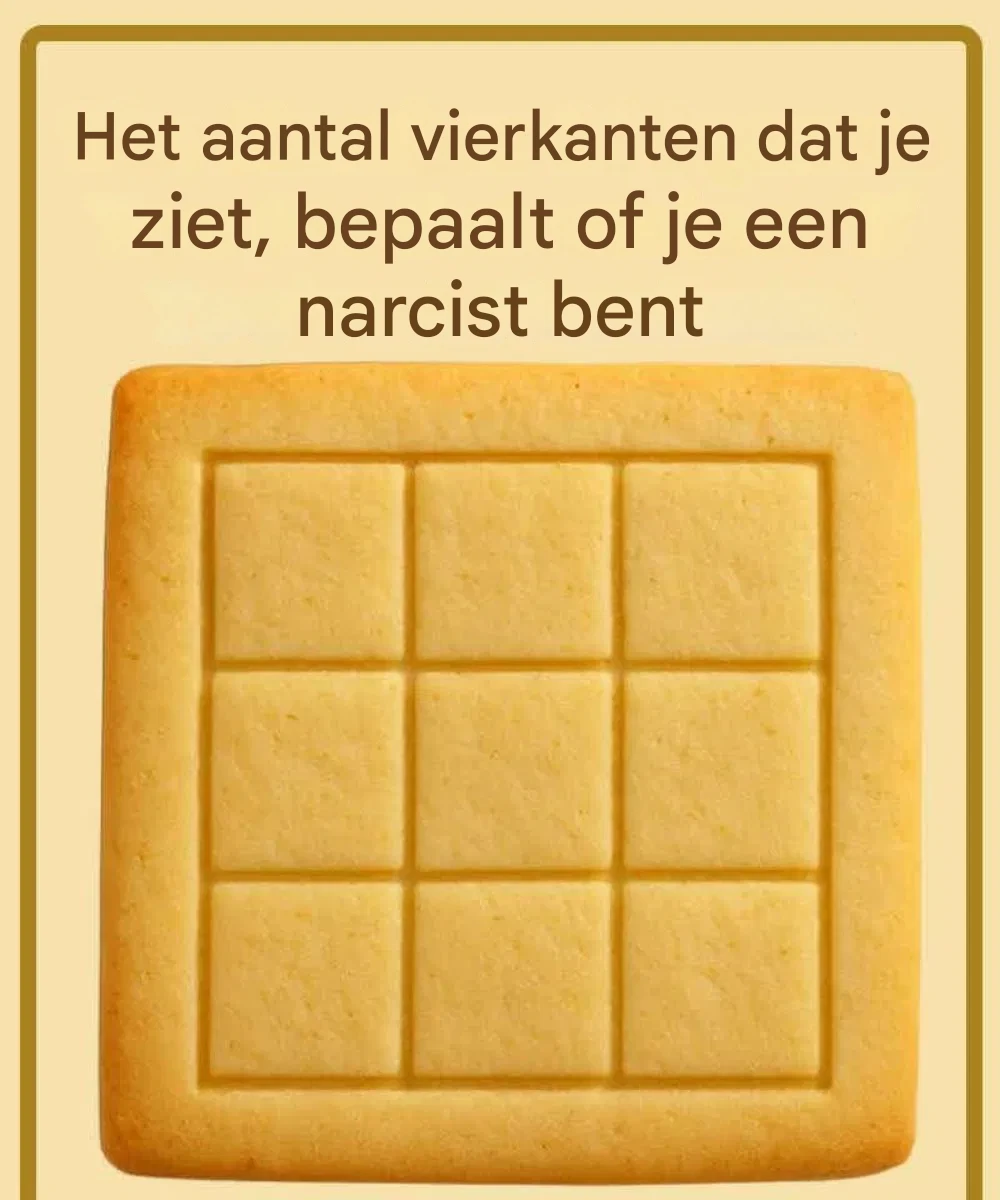 Op het eerste gezicht lijkt dit eenvoudige koekachtige beeld onschuldig – gewoon een raster dat in deeg is gesneden. Maar de vraag erboven: « Het aantal vierkanten dat je ziet, bepaalt of je een narcist bent », doet iedereen pauzeren. Het is een leuke psychologische illusie die online viraal is gegaan en duizenden debatten heeft aangewakkerd. Laten we eens kijken wat deze puzzel echt zegt over hoe je denkt, hoe oplettend je bent, en ja – of je misschien een paar narcistische neigingen hebt die zich verschuilen onder die kalme buitenkant.