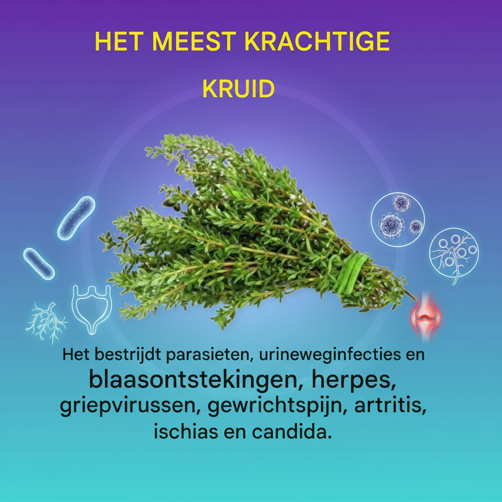 Tijm (Thymus vulgaris) is veel meer dan een aromatisch kruid dat onze gerechten verrijkt; het is een ware natuurlijke medicijnkast met een indrukwekkende reeks gezondheidsvoordelen. De geneeskrachtige werking komt van stoffen zoals thymol en carvacrol, die het zijn antimicrobiële, antioxidante en ontstekingsremmende eigenschappen geven. Deze kleine plant is een veelzijdig middel dat van binnenuit werkt en de ademhalings-, spijsverterings- en hart- en vaatstelsels ondersteunt, en zelfs de huid en het haar.