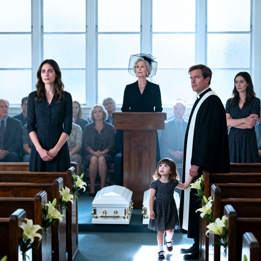 Pastoor John begon de dienst met een gebed dat hol aanvoelde in mijn oren. Mijn vierjarige dochter Emma zat naast me in haar zwarte jurk, ongewoon stil. Ze was bij haar oma geweest de nacht dat de tweeling stierf. Diane had erop gestaan ​​haar mee te nemen voor een logeerpartijtje, omdat ik rust nodig had na maandenlang voor een tweelingbaby te hebben gezorgd. Trevor had ingestemd voordat ik kon protesteren.