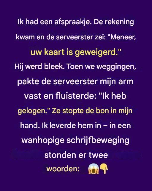 Toen de rekening kwam, keek de serveerster hem aan en zei zachtjes: « Meneer, uw kaart is geweigerd. » Hij werd bleek. Ik verwachtte verlegenheid, maar voordat ik kon reageren, schoof ze het bonnetje in mijn hand en fluisterde: « Ik heb gelogen. »