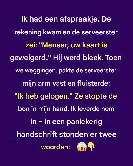 Toen de rekening kwam, keek de serveerster hem aan en zei zachtjes: « Meneer, uw kaart is geweigerd. » Hij werd bleek. Ik verwachtte verlegenheid, maar voordat ik kon reageren, schoof ze het bonnetje in mijn hand en fluisterde: « Ik heb gelogen. »