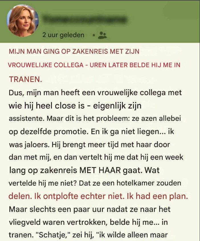 Maar na verloop van tijd stapelden de problemen zich op. Cameron bracht meer tijd met haar door dan met mij. Late vergaderingen. « Snel een drankje » na het werk. Conferenties die ze « moesten » bijwonen. Dus toen hij op een avond thuiskwam en terloops een vierdaagse zakenreis met Lucy noemde, voelde ik die bekende steek in mijn maag. Hij zag er nerveus uit, alsof hij al wist wat ik zou vragen.
