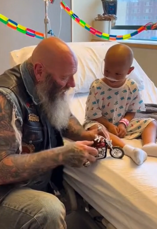 He pulled a chair closer and sat, careful not to loom. Another biker reached into his pocket and pulled out something small—a red toy motorcycle, shiny and clearly loved before it ever arrived.