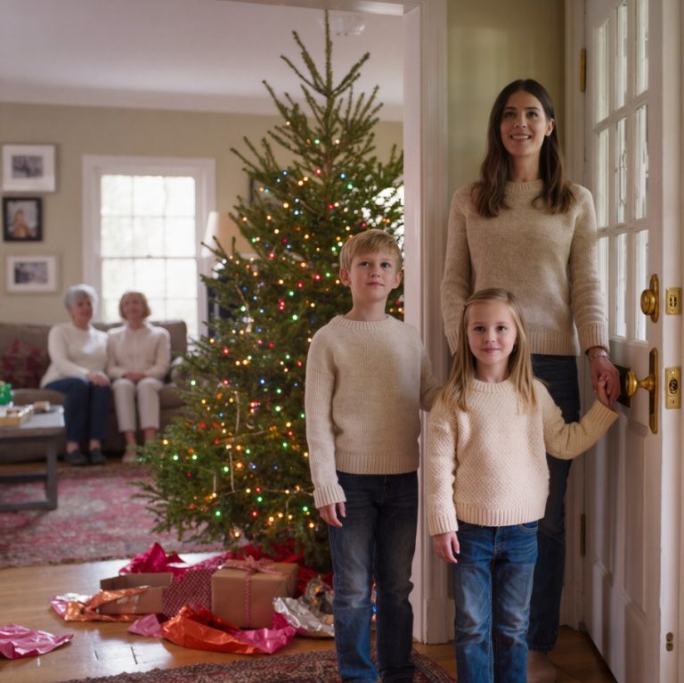 Ik wist meteen dat er iets niet klopte toen we de woonkamer van mijn moeder binnenstapten. De kamer was in tweeën gedeeld, als een toneeldecor: chaos en glitter aan de ene kant, een kaal tapijt aan de andere. Michelles kinderen waren al helemaal in de weer met inpakpapier, rennend rond fietsen, een spelcomputer en dozen die als een fort opgestapeld stonden. Aan de andere kant, waar mijn kinderen normaal gesproken hun cadeautjes vonden, was niets anders dan stofzuigstrepen en een hoekje beige tapijt. De achtjarige Emma, altijd beleefd, zelfs als ze in de war was, zat op mijn schouder; de zesjarige Jake drukte zijn gezicht tegen mijn jas, serieus en zwijgend.