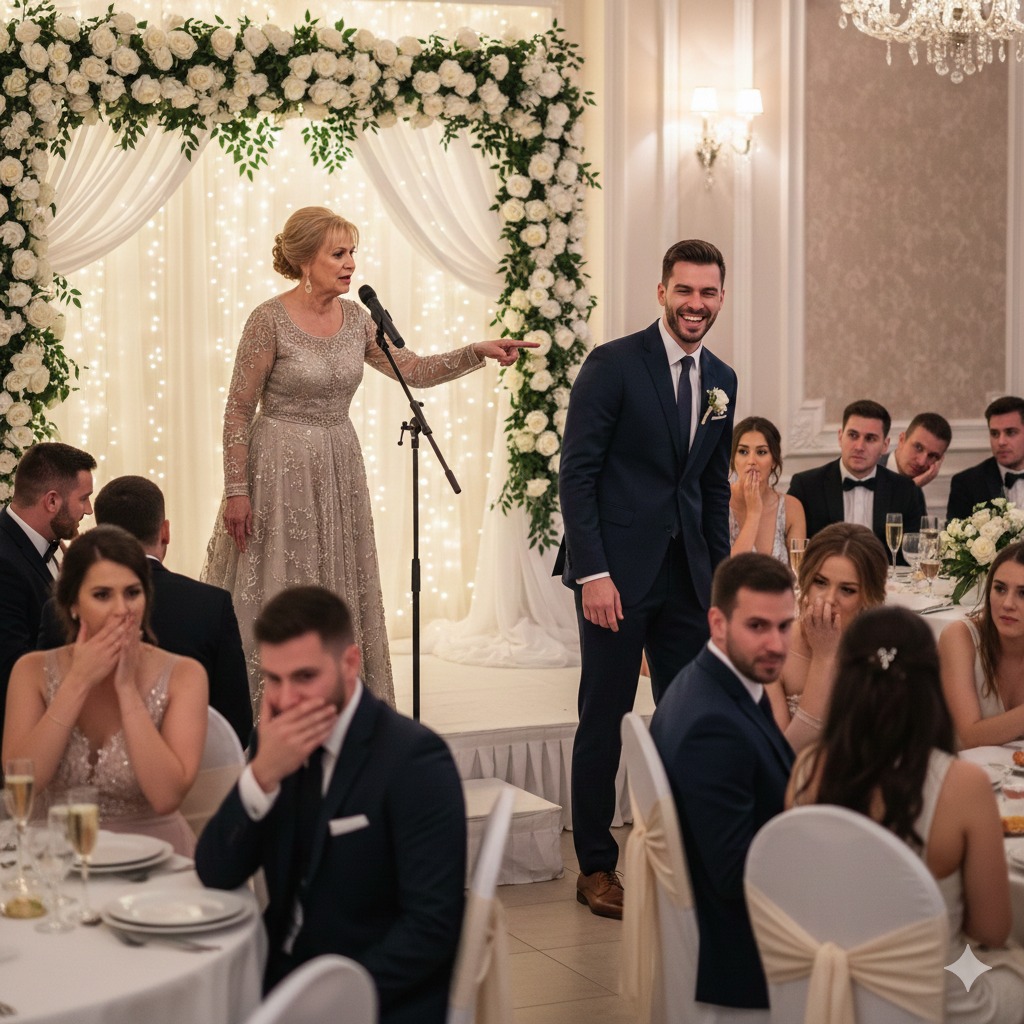 De dj stond stokstijf, de microfoon half opgetild. De bruidsmeisjes draaiden zich om, met open monden. Zelfs de kroonluchter leek ongelovig te flikkeren.