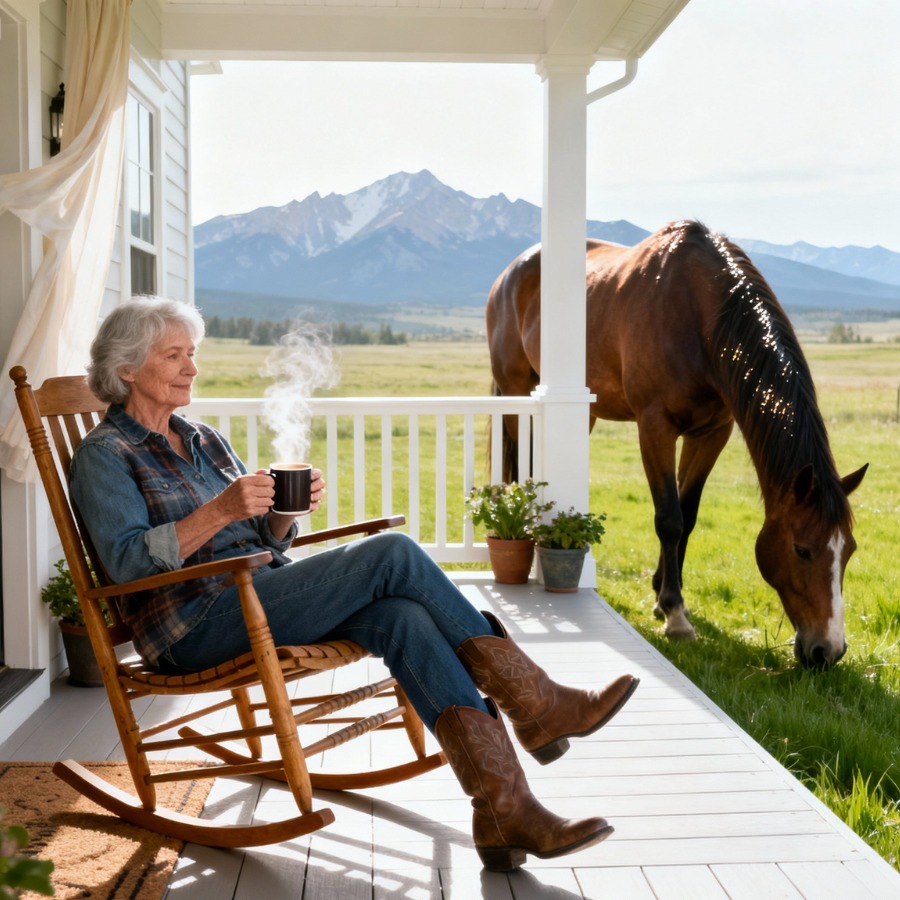 De ranch in Montana strekte zich uit over tachtig hectare van Gods mooiste werk. Bergen kleurden de horizon paars bij zonsondergang. Mijn ochtenden begonnen met sterke koffie op de veranda, kijkend naar de mist die uit de vallei opsteeg, terwijl mijn drie paarden – Scout, Bella en Thunder – in de wei graasden. De stilte hier was niet leeg. Hij was vol betekenis. Vogelgezang, wind door dennenbomen, het verre gezoem van vee van naburige boerderijen.