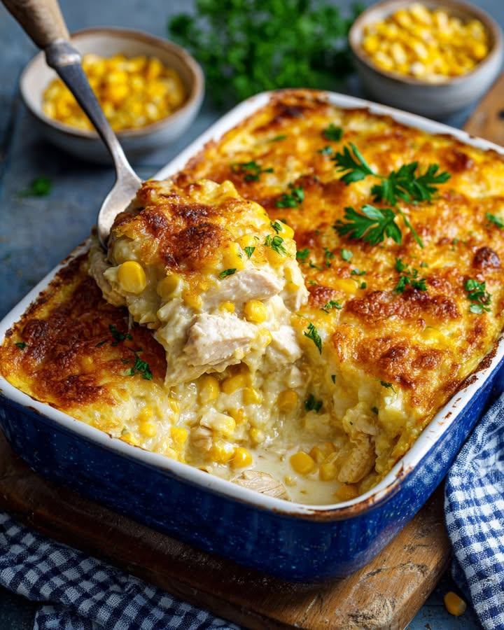 Deze romige, in de oven gebakken kip-maïsgratin is een heerlijk en makkelijk te bereiden gerecht. Het bestaat uit malse kipreepjes en twee soorten maïs, overgoten met een rijke, smaakvolle saus met kaas, en vervolgens goudbruin gebakken.