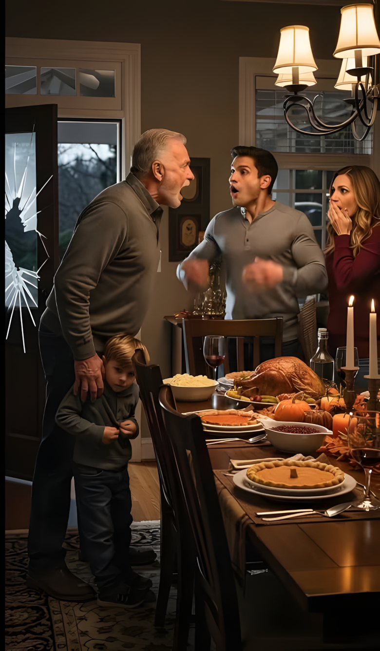 Zijn moeder en stiefvader zaten binnen te eten. Ze hadden hem eruit gegooid omdat hij de kalkoen had aangebrand. Ik trapte de deur in. Zijn stiefvader grijnsde: « Hij is niet van mijn bloed. » Ik keek hem recht in de ogen en zei zes woorden… Hun gezichten verbleekten.