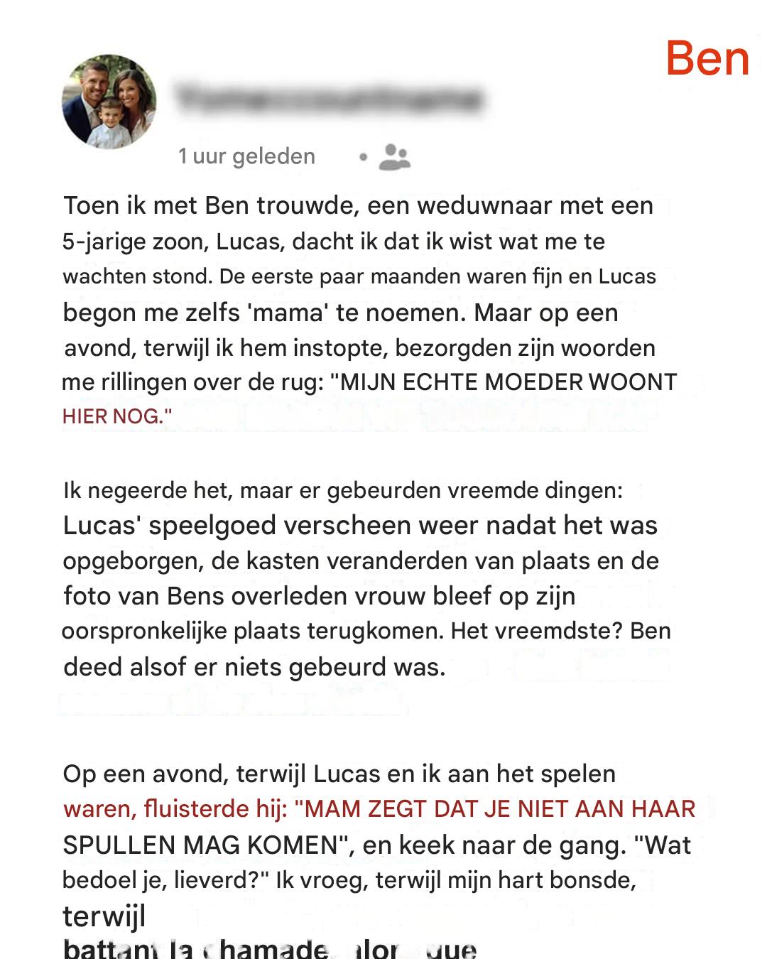 Ik trouwde met een weduwnaar met een jonge zoon. Op een dag vertelde de jongen me dat zijn echte moeder nog steeds in ons huis woonde.