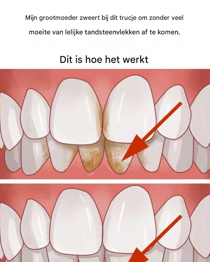 Een goede mondhygiëne is essentieel, niet alleen voor een stralende glimlach, maar ook voor een goede algemene gezondheid. Een van de meest hardnekkige gebitsproblemen is tandsteenvorming. Tandsteen is verharde tandplak en kan, als het niet wordt behandeld, leiden tot tandvleesontstekingen, gaatjes en zelfs tandverlies. Helaas zijn regelmatig poetsen en flossen vaak niet voldoende om dit probleem te voorkomen. Ontdek de beproefde methode van mijn grootmoeder om die lelijke tandsteenvlekken bijna moeiteloos te verwijderen. Deze wondertruc heeft een revolutie teweeggebracht in ons gezin. Het biedt een eenvoudige maar effectieve oplossing voor een veelvoorkomend probleem.