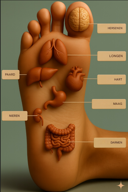 - De Volledige Kaart: Wanneer de twee voeten samen worden geplaatst, vormen ze een perfect, gemakkelijk leesbaar schema van het menselijk lichaam, van het hoofd (de tenen) tot het bekken (de hielen).
