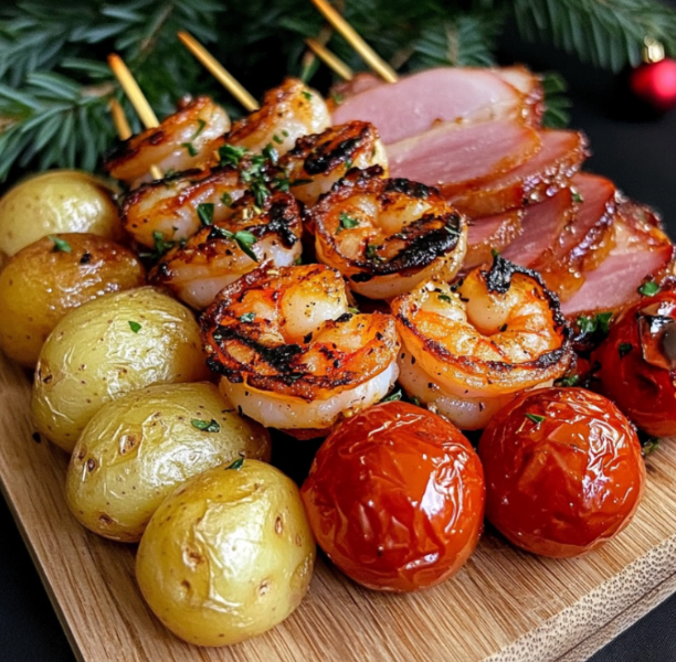 Een feestelijk bord met gegrilde garnalen, geroosterde tomaten en prosciutto is een elegante en tegelijkertijd heel eenvoudige aangelegenheid voor speciale gelegenheden. Het is perfect als hoofdgerecht voor de kersttafel, een spectaculair diner voor gasten of een verfijnde maaltijd om te delen met dierbaren.