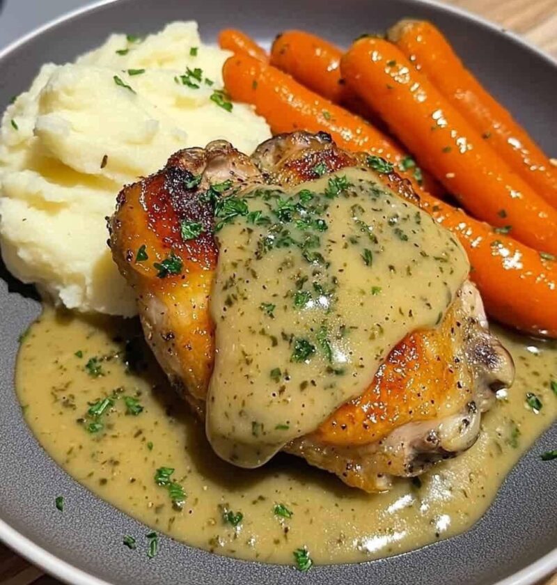 Goudbruin gebakken kip met een romige kruidensaus, geserveerd met luchtige aardappelpuree en worteltjes met boter. Een echt troostende en heerlijke maaltijd!