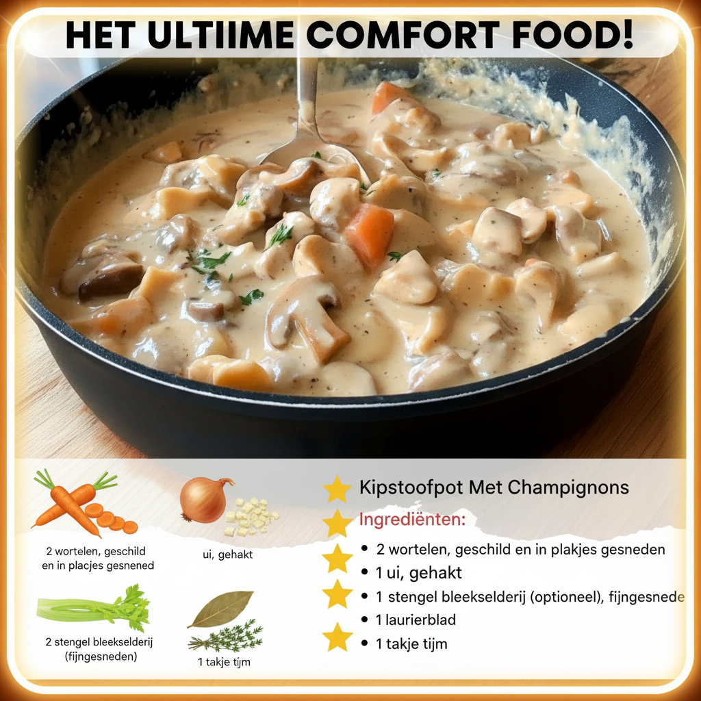 Deze kipstoofpot met champignons is het ultieme comfort food. Een gerecht dat langzaam pruttelt, het huis vult met een heerlijke geur en iedereen aan tafel samenbrengt. Perfect voor koude dagen, maar eigenlijk het hele jaar door onweerstaanbaar. Zacht gegaarde kip, romige saus en volle smaken – precies zoals grootmoeder het maakte.