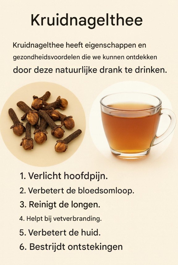 Heb je ooit het gevoel gehad dat je lichaam snakt naar een oppepper, natuurlijke verlichting van ontstekingen, pijn of die vermoeidheid die je uitstraling dof maakt? Kijk eens in je voorraadkast: die kleine kruidnagels, zo alledaags in de keuken, bezitten zo’n intense kracht dat ze de sleutel kunnen zijn tot het revitaliseren van je gezondheid zonder dure medicijnen. Kruidnagelthee, een warm en aromatisch elixer, is niet zomaar een drankje; het is een eeuwenoude schat die generaties lang genezing heeft gebracht, van Aziatische keukens tot de remedies van Latijns-Amerikaanse grootmoeders. Wat als ik je vertelde dat elke slok je maag kan kalmeren, je immuunsysteem kan versterken, je bloedsomloop kan verbeteren en je zelfs kan beschermen tegen ernstige ziekten? Lees verder, want dit geheim is niet alleen goed voor je lichaam; het raakt je ziel en wekt een energie op waardoor je je levendig, sterk en verbonden met de magie van de natuur voelt.