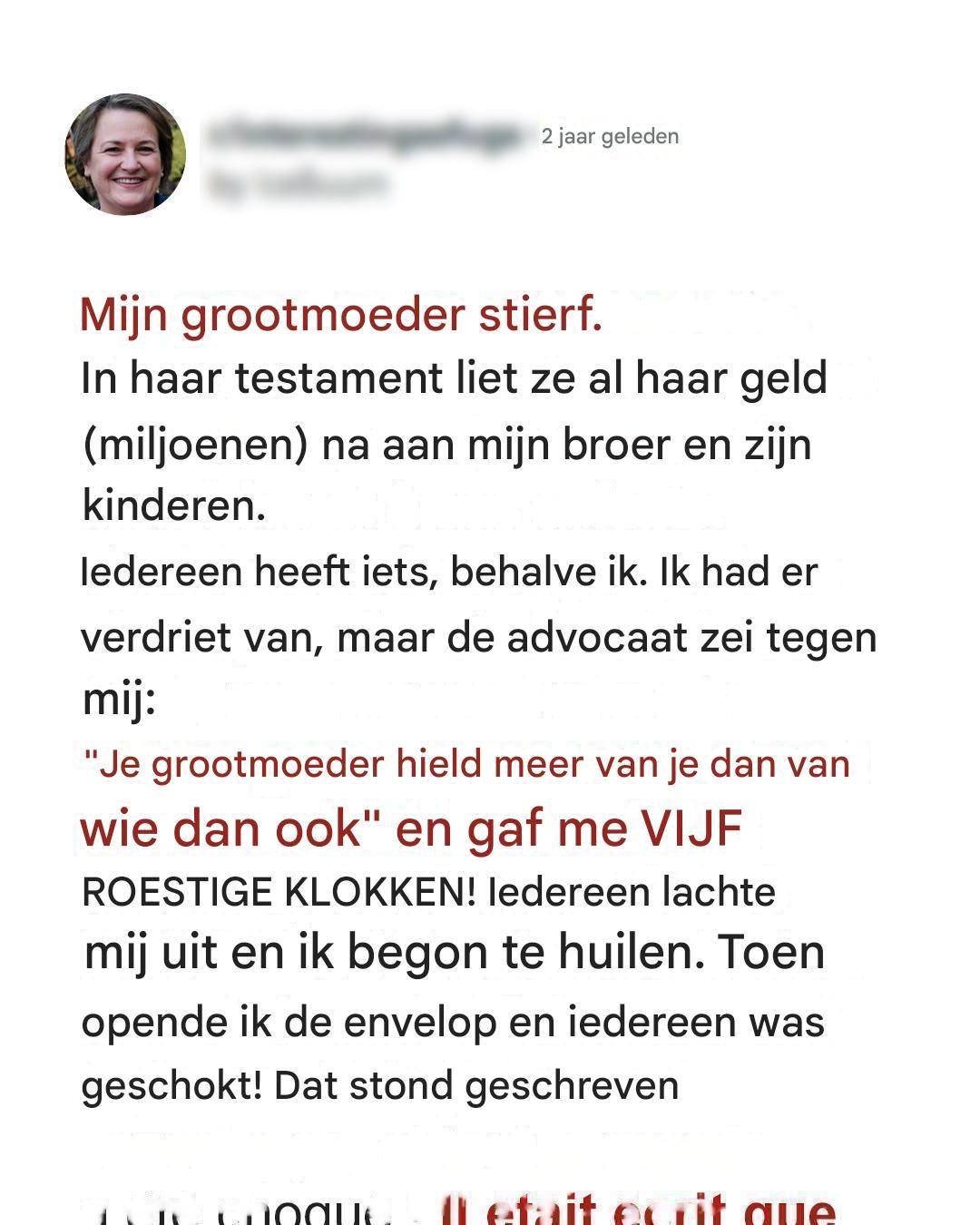 Hij liep dichterbij en zag dat zijn grootmoeder ziek en mager was. Maar hij maakte zich geen zorgen en bleef gewoon staan, wachtend op de vraag waarom ze hen had gebeld.