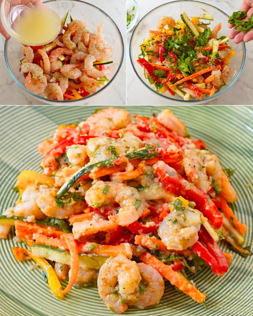 Meng in een kom de gepelde en ontdarmde garnalen met de groentenblokjes.