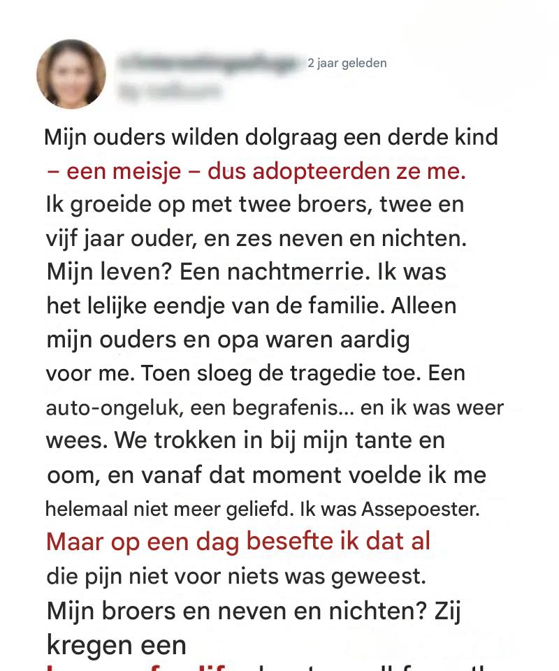 Na jarenlang geprobeerd te hebben een derde kind te krijgen – een dochter om het gezin « compleet » te maken – adopteerden ze me.