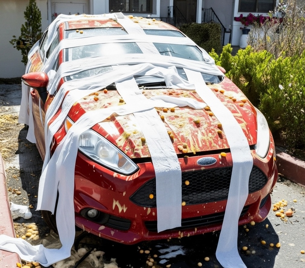 De ochtend voor Halloween deed ik mijn voordeur open en verstijfde. Mijn auto was beplakt met eierdooiers en bedekt met wc-papier.