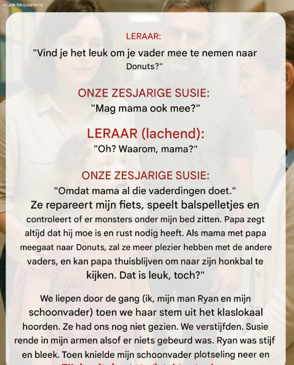 De rit naar huis was stil—niet gespannen, niet boos, gewoon stil. Alsof er iets heiligs tussen ons was geplaatst en we het niet durfden te verstoren. Ik keek recht vooruit, handen gevouwen, terwijl Susie op de achterbank neuriede. Ryan hield beide handen op tien en twee de hele rit vergrendeld.