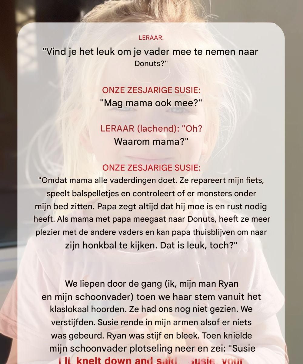 Hij werkte parttime bij het bedrijf. Ik werkte op afstand en liet Susie vaak op mijn schoot zitten tijdens vergaderingen. Ik werd degene die voor alles zorgde: doktersafspraken, haar avondritueel, geschaafde knieën, appels snijden precies zoals Susie het lekker vond. Hij hielp af en toe – misschien met de hond. Ik overtuigde mezelf ervan dat het op de een of andere manier wel goed zou komen.
