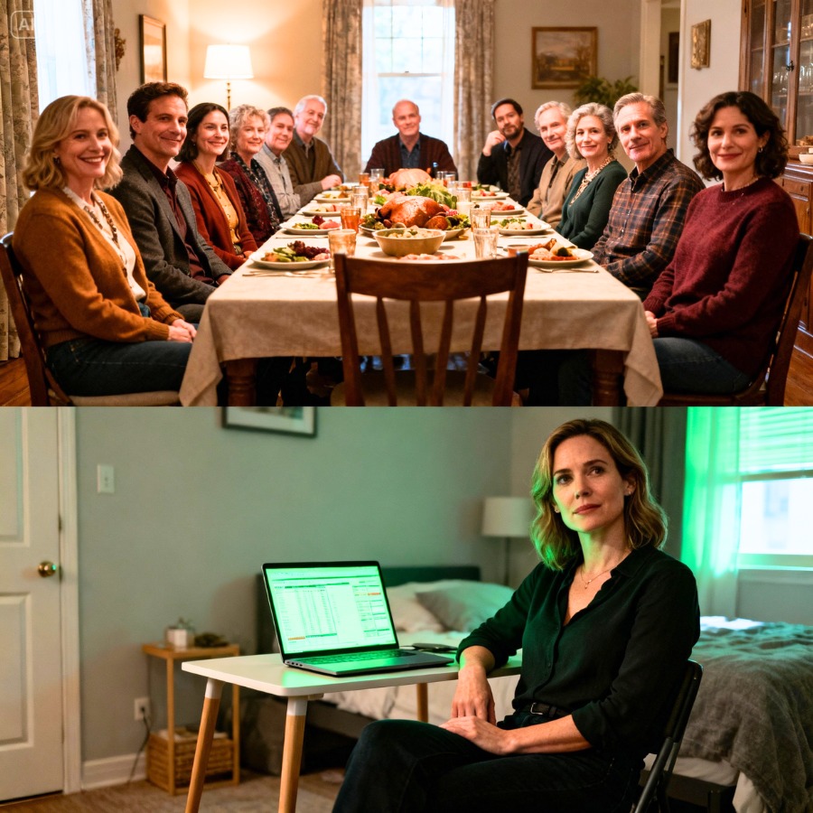 Mijn moeder stuurde me een sms’je dat alles veranderde. Er stond: « We willen niet dat je voor ieders neus om geld vraagt. Blijf dit jaar thuis. » Ik staarde een hele minuut naar mijn telefoon. Toen moest ik lachen, niet omdat het grappig was, maar omdat er $4,7 miljoen op mijn bankrekening stond. Mijn familie had besloten dat ik blut was. Ze hadden het niet gevraagd. Ze gingen ervan uit en ze hadden me niet uitgenodigd voor Thanksgiving om zichzelf voor schaamte te behoeden.