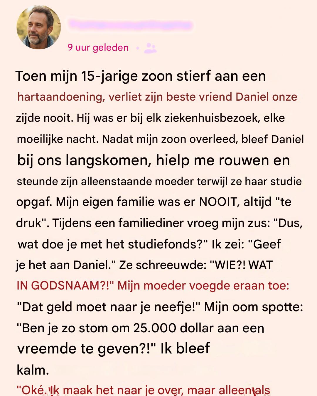 Mijn familie vocht om het studiefonds van mijn overleden zoon — totdat ik één vraag stelde die hen allemaal ontmaskerde