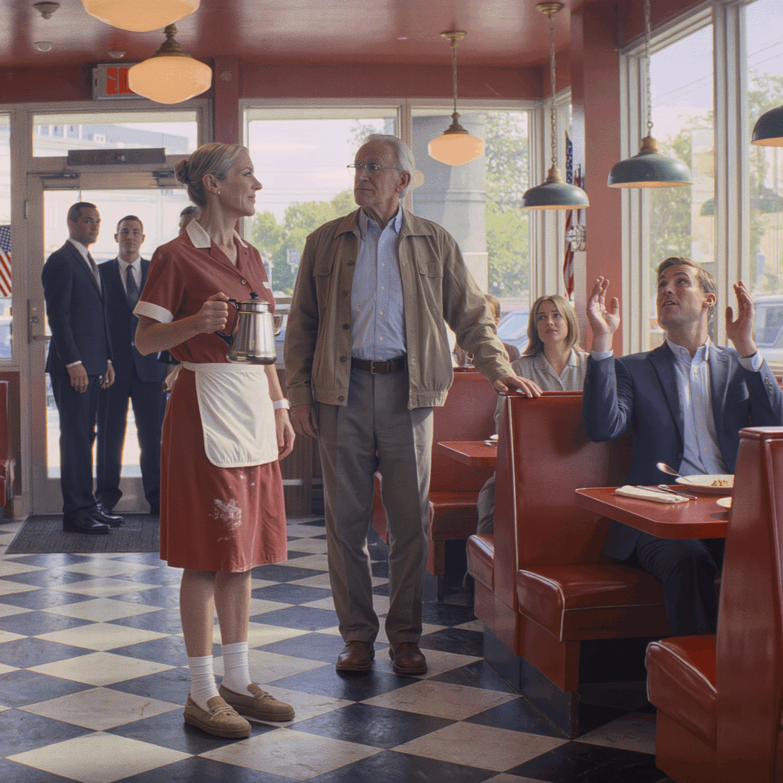 Door mijn kinderen bestolen te zijn, belandde ik op mijn zestigste als serveerster. Elke dag deelde ik mijn lunch met een trillende oude man die binnenkwam met een zak vol muntjes en een stille glimlach. Op een middag kwam mijn zoon het restaurant binnen, lachte om mijn ondergang en zei dat ik er zielig uitzag voor iedereen. Een paar minuten later stormden vier lijfwachten naar binnen.