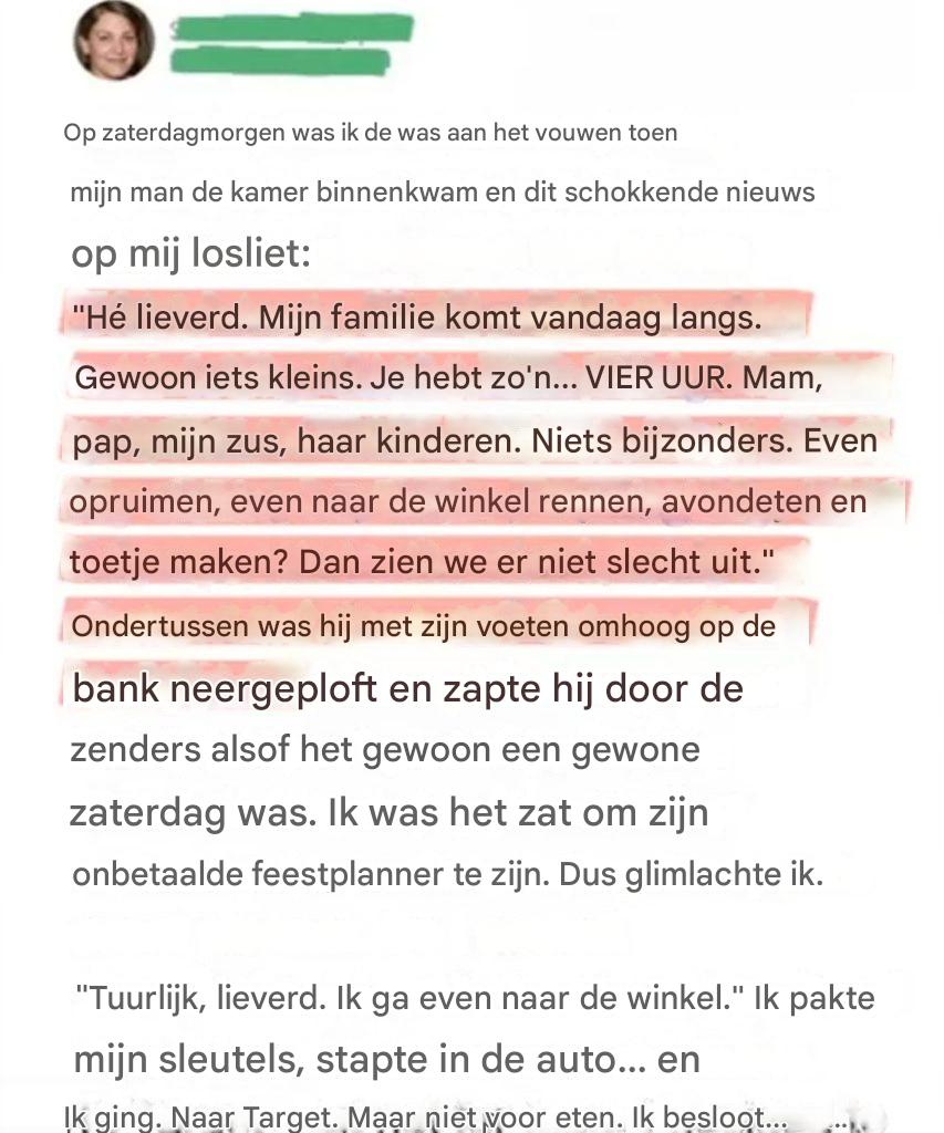 Maar in plaats van ruzie te maken, glimlachte ik en zei: « Natuurlijk, ik ga naar de winkel. »