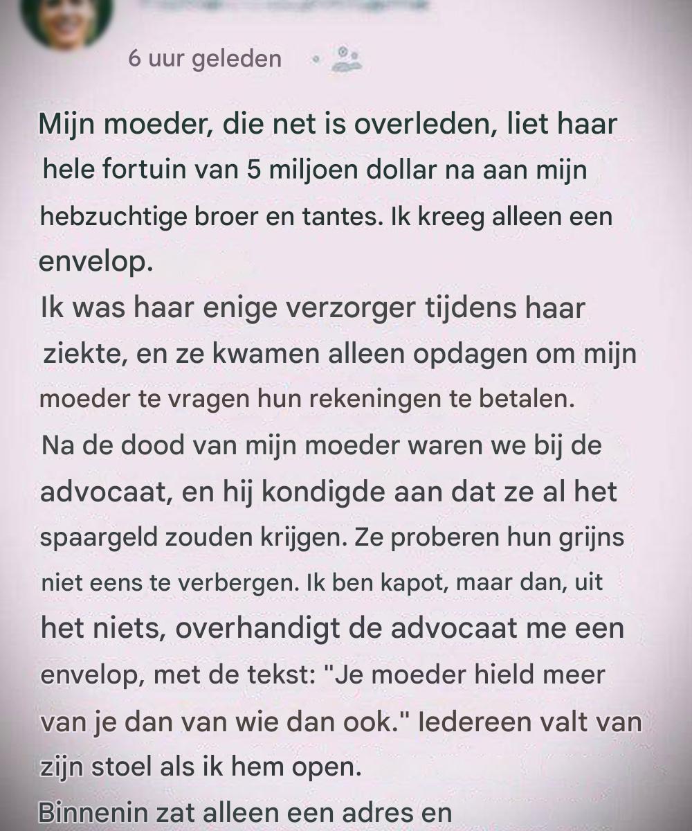 Mijn moeder, die net was overleden, liet haar hele nalatenschap van 5 miljoen dollar na aan mijn hebzuchtige broer en tantes. Ik kreeg alleen een envelop. Ik zorgde ervoor tijdens elke slapeloze nacht en doktersafspraak, en ze kwamen alleen als ze geld nodig hadden.
